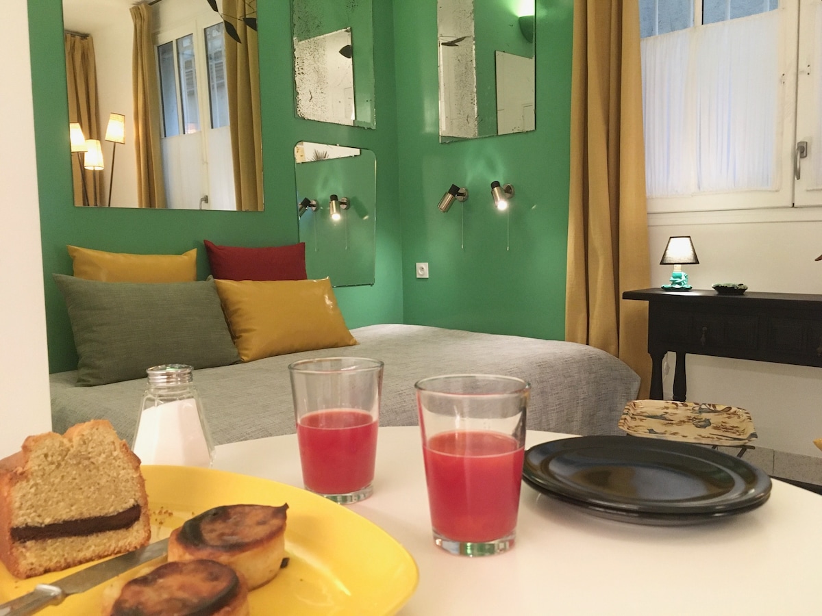 Centrally located, this is an elegant and delightful studio apartment has been skilfully renovated and counteracts the classically historic surroundings with a clean-lined modern interior, situated on the 2nd floor of a historic building. With high ceilings, parquet flooring throughout, and overlooking a quiet street this is a bright, fresh and spacious apartment. It has a well laid out equipped kitchen, including a stove, micro wave, fridge/freezer, coffee- maker (nespresso) and washer-dryer machine and a dish washer. The whole apartment is very peaceful and quiet. It is comprehensively furnished, with a queen sized bed, fitted cupboards and wifi. Elegantly designed with all the modern amenities and located in the charming Montorgueil district makes this apartment perfect for a memorable stay in Paris. Neighborhood Insight: The Quartier Montorgueil is famous for its market and semi-pedestrian streets full of beautiful shops and restaurants. Decadent, traditional, and sometimes downright sinful, the 2nd is the neighbourhood Émile Zola called "The Belly of Paris", the traditional central market from which a network of passageways and cobbled streets ripple out. The marché Montorgueil is one of Paris's most famous markets, a kingdom of food in itself full of amazing boulangeries, butchers, cheese shops, wine cellars and cafés... A dream come true for a gourmet. The luminous Galerie Vivienne, opened in 1823, has been entirely renovated, under whose glass ceilings you'll find the charming tea salon A Priori Thé, the perfect spot for a relaxing lunch or tea. The neighborhood is lively and safe; very central you are within walking distance of the Louvre and the Centre Pompidou but also less than 30 minutes away from most of the tourist attractions and sites of Paris. Floor:2nd Surface:27 sqm, Accommodates:2 people, Type:Studio Internet:Yes, BroadBand Access 20M unlimited ADSL, wire and wireless (included) Metro: Etienne marcel (L-4) (Website hidden by Airbnb) Included in the Apartment: - Detailed apartment functional guide - High Quality Linens and towels - Full stocked kitchen for creative cooks - Books, magazines, artist’s editions, etc. - NON smoking policy Access: - Security Code with Interphone Bathroom: - Shower Kitchen: - Stove - Microwave - Nespresso Machine - Water Kettle - Refrigerator - Dish Washer Housekeeping: - Washing & Dryer Machine - Iron Communication: - High-Speed Wireless Internet Early Check in Fee = 50e Late Check Out Fee = 50e until 16h00 If you want to do a early check in or a late check out please let me know ,