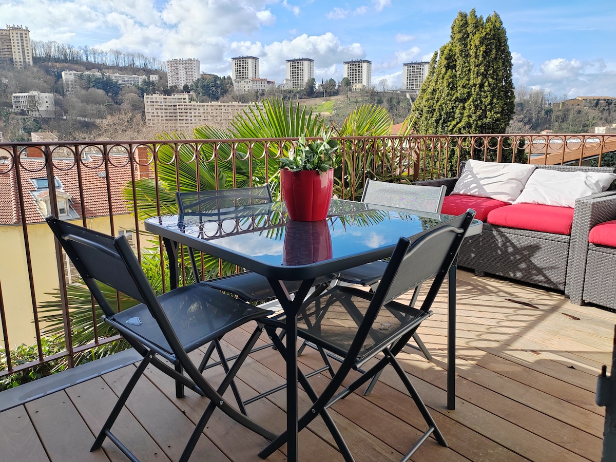 Appart CLIMATISE. TERRASSE PRIVATIVE AU COEUR DE LYON. Vue incroyable sur la Basilique de Fourvière , les quais de Saône et les SUBs. L'appartement est composé de 2 chambres+ 1 Salle de Bain +1 WC+1 espace bureau + 1 cuisine/ salon avec un canapé lit 2 pers IDEAL pour 2 ou 4 personnes, pour séjour business, famille TRES EXCEPTIONNELLEMENT 6 Personnes (sup) Parking très facile dans la rue (tarif de la ville ) Bus à proximité - Entrée en toute autonomie