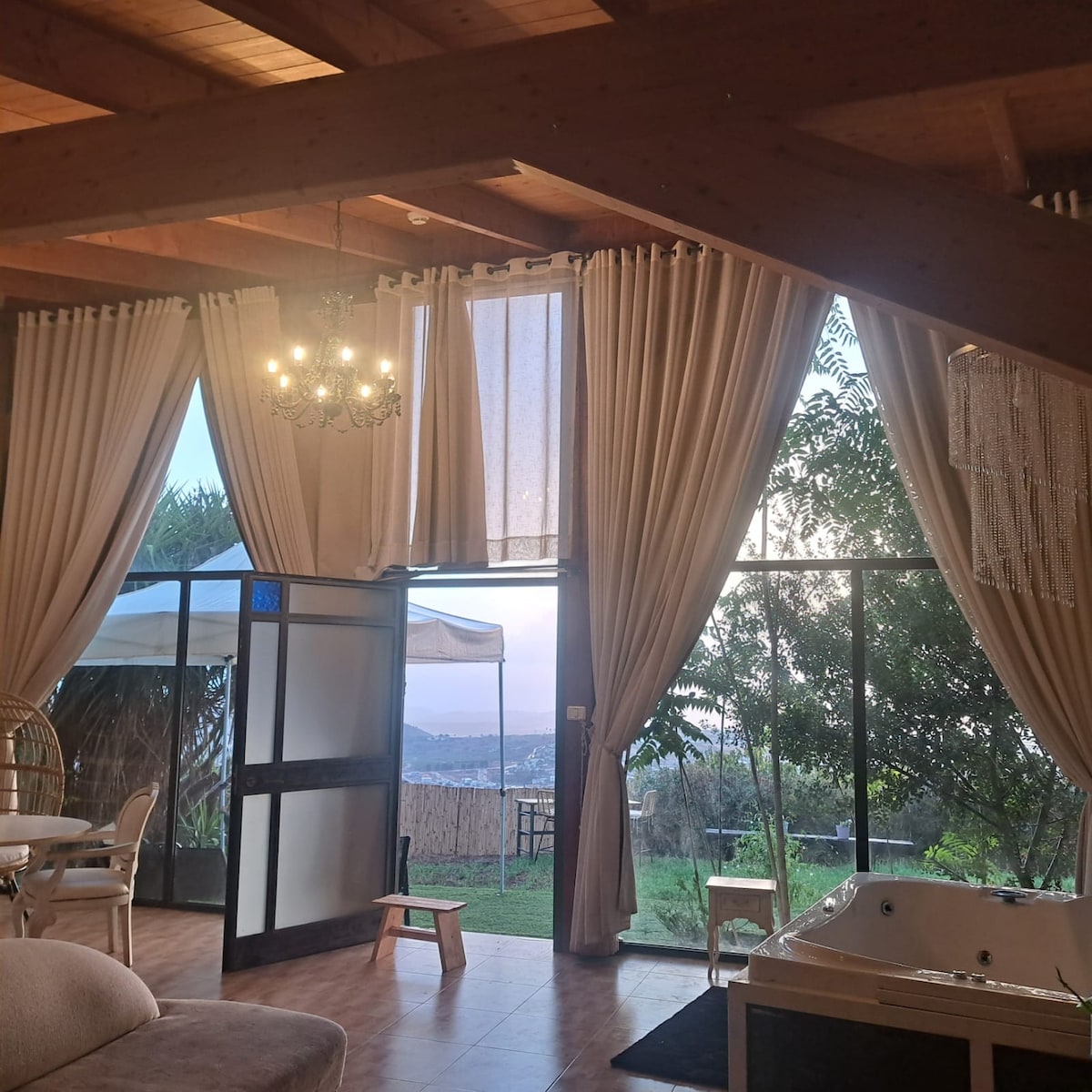 갈릴리 자연 속에서 또 다른 고급스러운 환대 경험을 하실 수 있습니다. 독특한 연장 및 휴식 공간 2층에 위치하여 매혹적인 전망이 내려다보이는 2개의 발코니가 있습니다. 탁 트인 풍경 앞에서 휴식을 취할 수 있는 다양한 코너. 두 개의 샤워기가 있는 크고 편안한 욕실. 현대적인 간이 주방, 바 테이블, 야외에 있는 오두막 탭 스파, 멀티미디어 시스템에 연결된 TV, 해먹, 커다란 창문 앞에 놓인 명상 의자 등. 커플을 위해 설계된 숙소입니다. 자연이 마음을 사로잡는 환경에서 퀄리티, 낭만, 푹신한 시간을 원하는 사람. 대신 총체적인 마사지 트리트먼트를 받을 수 있는 경우 사랑으로 오세요...