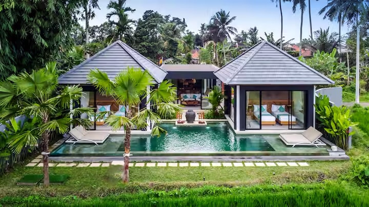 Welcome to our private villa close to downtown Ubud, where style and luxury meet in the most breathtaking way. Our 3-bedroom retreat is perched on the edge of a lush tropical gorge, with a glass-bottomed pool, a treetop yoga deck, and a hidden bar for you to enjoy your favorite libations. The villa is a mix of modern designs with chic furnishings, local artwork, and plenty of cozy nooks to snuggle up in. Come experience the hippest hideaway in town – book now and indulge in the ultimate escape!