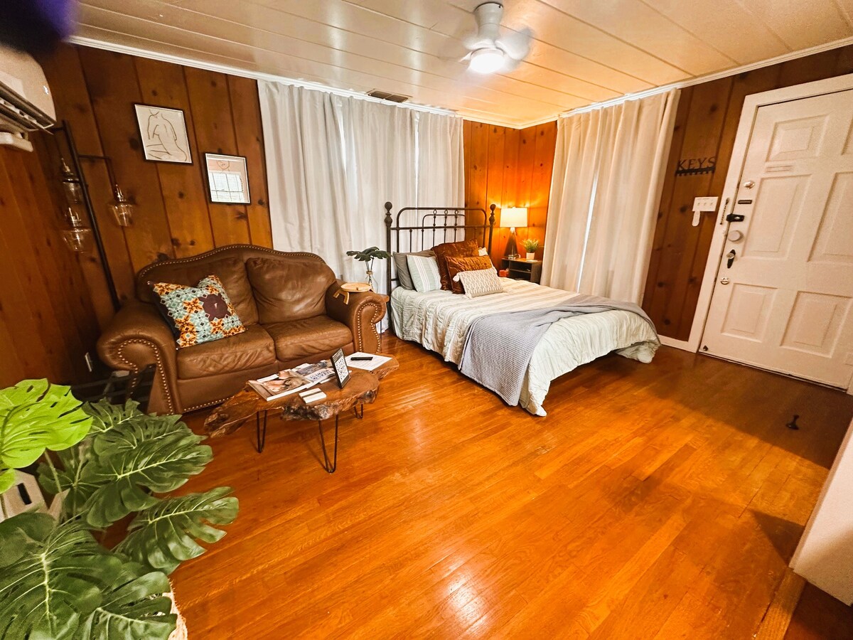 전용 출입구! 매우 깨끗하고 평화롭고 중심부에 위치한 뒷마당 방갈로. 편안한 퀸사이즈 침대, 푸톤, 와이파이, TV(스트리밍 서비스 사용), 냉장고, 큐리그 커피포트, 전자레인지, 대형 워크인 샤워실이 있는 매우 편안한 객실을 즐겨보세요. 방갈로 외부에 파티오와 넉넉한 주차 공간이 있습니다. 마당은 본채와 공유하는 마당 공간입니다. 저는 매우 친절한 개 2마리를 키우고 있으며, 다른 반려동물과 마당을 공유하지 않습니다.