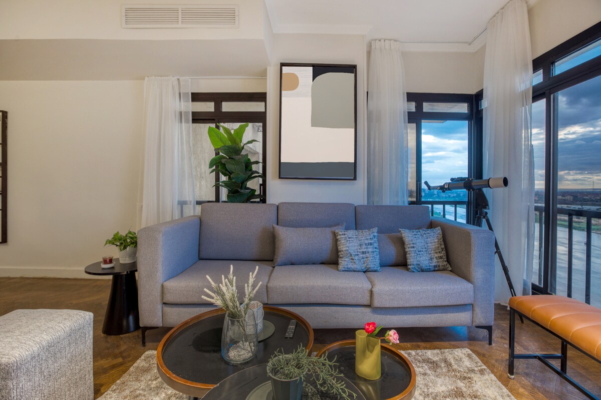 스타일리시한 마디 아파트에서 나일강과 장엄한 피라미드의 숨 막히는 전망을 감상하세요. 레스토랑, 상점, 교통편에 쉽게 접근할 수 있는 조용한 최고의 지역에 위치하고 있습니다. 리셉션과 침실에서 자연 채광, 현대적인 가구, 멋진 풍경을 즐겨보세요. 카이로에서 가장 매력적인 지역 중 하나에서 편안함, 편리함, 잊을 수 없는 전망을 찾는 커플, 가족 또는 출장자에게 적합합니다.