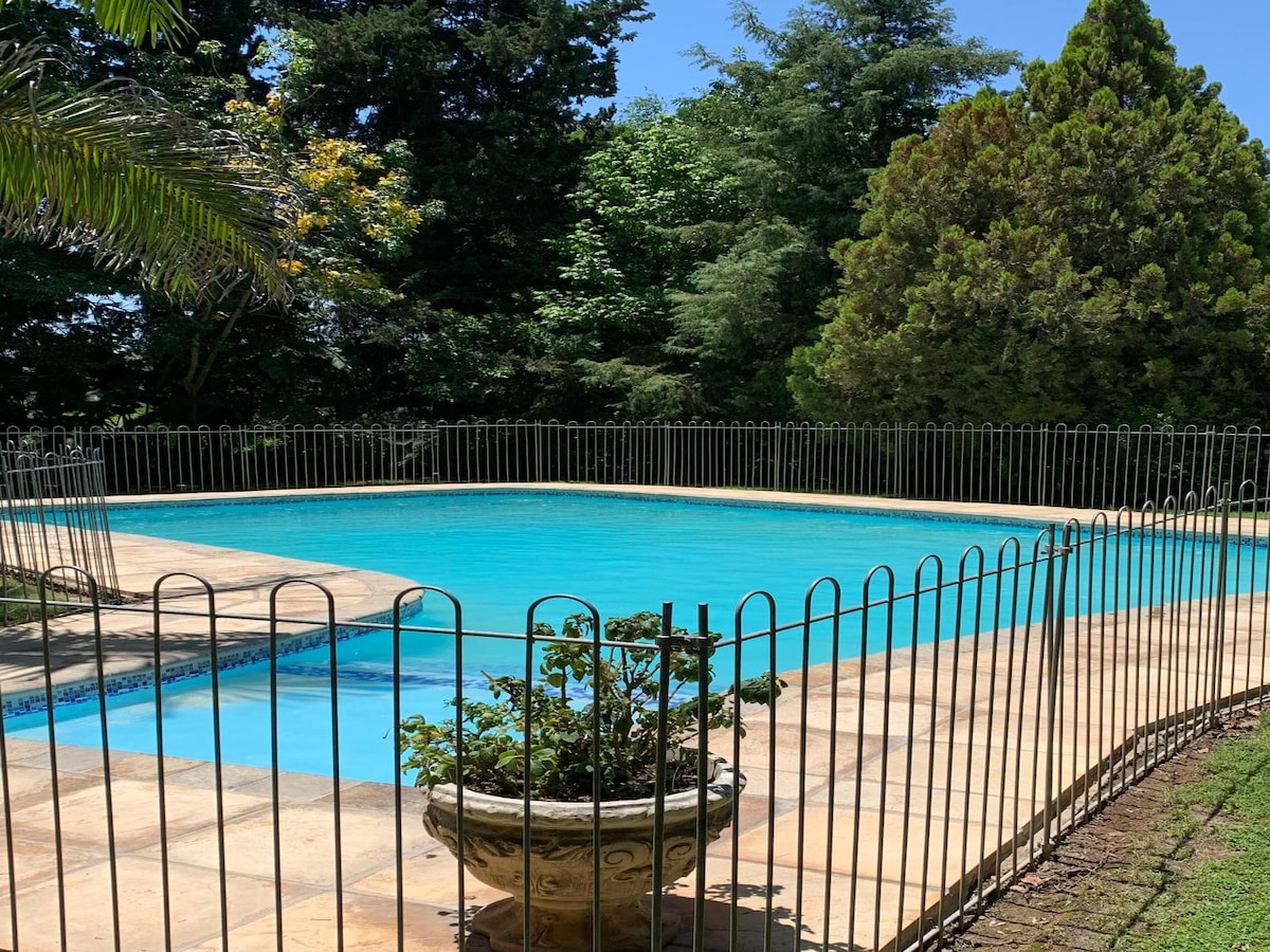 Experience the perfect blend of nature and comfort with your own swimming pool at our small family farm. You'll be surrounded by wild peacocks, free-range chickens and donkeys. Plus: - FREE 28-Page Garden Route Travel Guide - When you book with us, you’ll receive our exclusive Travel Guide full of hidden gems, activities, national parks, and extra safety and travel tips for your journey. - Homemade Breakfast Incl. - 2min Drive to 1# ranked Beach in Town - 1min Drive to Golf Club with Zebra's