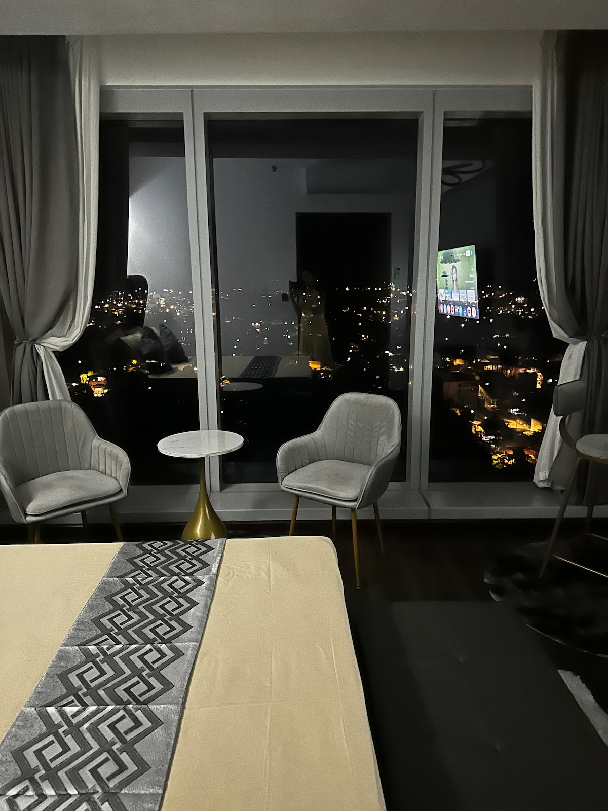다바오에서 가장 권위 있는 아이언 타워의 세련된 고층 콘도에서 현대적인 편안함과 우아함을 경험해 보세요. 출장자, 커플, 레저 여행객에게 적합한 이 숙소는 도시와 산의 숨 막히는 파노라마 전망을 감상할 수 있습니다. 마음에 드실 만한 점: ✔ 넓고 가구가 완비된 침실 1개 숙소 ✔ 바닥부터 천장까지 이어지는 통유리창을 통해 자연광과 멋진 도시 풍경을 감상할 수 있습니다. 업무 및 엔터테인먼트를 위한✔ 초고속 와이파이 및 스마트 TV 일몰 또는 도시 야경을 즐길 수 있는✔ 발코니 편의시설 ✔ 이용