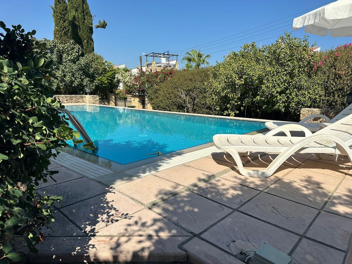 Villa in the TOP 10% Airbnb. 5 minutes from the beach, aqua park and casino of Acapulco Hotel, 20 minutes to center of Girne. The house has large cinema, massage chair, luxurious marble furniture, panoramic views and free electric transport! This exquisite twin-villa (duplex) in gated complex with 3 pools has privat garden, font, ping pong, mangal, swing, trampoline and 2 fountains. Two shops, two restaurants and a cafe near the house. Parties and the invitation of outside women are prohibited.
