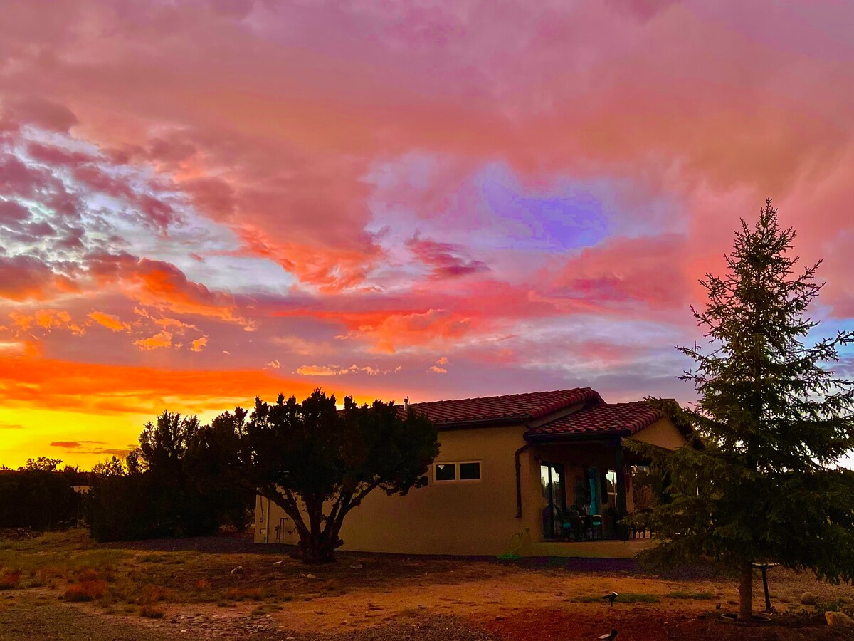 넓고 햇살이 잘 드는 자립적인 스튜디오로 멋진 산 전망을 자랑합니다. 전용 출입구와 금붕어 연못이 있는 전용 파티오. 시설 완비. 퀸사이즈 침대, 3/4 욕실, 간이 주방, 벽난로. 도시 남서쪽에 위치하고 있으며 3.65km²의 부지에 360도 전망을 자랑합니다. 멋진 하늘 구경. 산타페이 스키 분지, 하이드 파크 및 기타 야외 사이트에서 가깝습니다. 플라자 및 캐년 로드에서 7마일, 산타페이 오페라에서 10마일, 앨버커키에서 60마일 거리에 있습니다. 599 바이패스로 쉽게 이동할 수 있습니다.
