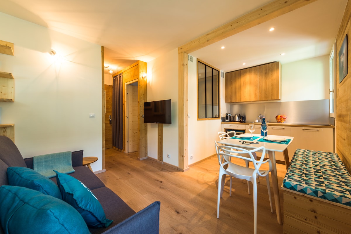 샤모니에서 독특한 에어비앤비 경험! 아름답게 리모델링한 침대 1개/욕실 1개 아파트는 샤모니 몽블랑 도심에 있는 마법 같은 알파인 산악 휴양지입니다! 몽블랑 산의 놀라운 전망을 감상할 수 있고 중심부에 위치한 이 평화로운 600평방 피트 숙소는 샤모니 지역과 주변 산을 둘러보기에 완벽한 숙소입니다!