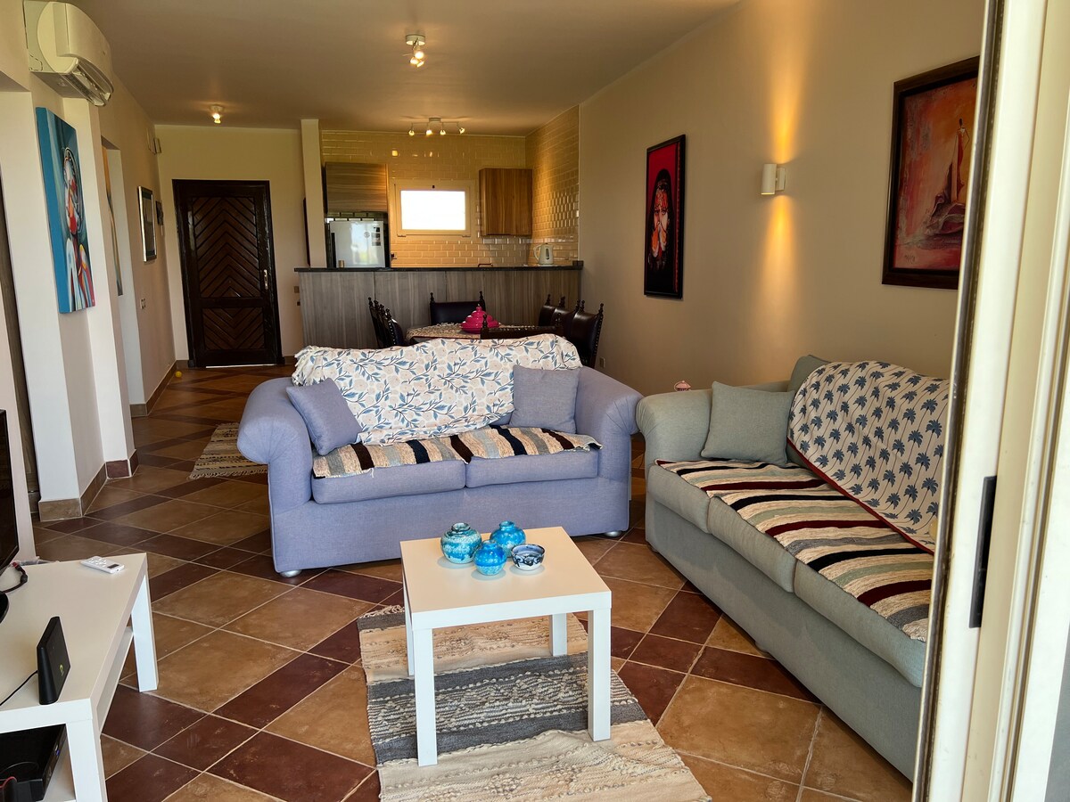 Rocky beach! Families only! sit back and relax at Stella Sea View Ain Sokhna. A standalone home, first row on the beach. Wake up to a beautiful view & a well designed space. The coral & green tones of this home blend perfectly - making this vacation home aesthetically divine. With a big terrace on the beach, you are 2 steps away from the shore and the shared pool. Just relax and take a break from the busy city life. A quiet private location that will certainly put you in a state of pure bliss