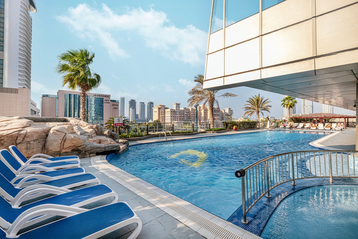 월간 할인 가능! 킹사이즈 침대, 고급 침구, 자연 채광을 위한 바닥에서 천장까지 이어지는 창문이 있는 세련된 고층 스튜디오. 전용 책상에서 재택근무를 하거나 아늑한 독서 공간에서 휴식을 취해보세요. 55인치 스마트 TV, 초고속 와이파이, 2인용 세련된 식사 공간을 즐겨보세요. 시설이 완비된 주방에는 필요한 모든 것이 갖춰져 있으며, 세련된 욕실에는 푹신한 수건과 필수품이 구비되어 있습니다. 발코니에서 도시와 수영장의 멋진 전망을 감상해보세요. 도시에서 완벽한 휴식을 즐길 수 있습니다!