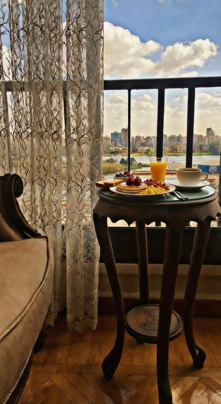 A cozy Nilefront apartment with a beautiful panoramic river and city view. Bright living room with full glass windows, relaxing seating area, and a warm modern design — perfect for couples, families, and business stays.