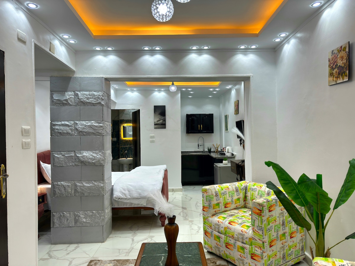 피라미드와 새로운 박물관에서 불과 5분 거리에 있는 깨끗한 스튜디오 아파트에 머물러 보세요. 저희 숙소에는 시설이 완비된 주방과 아늑한 거실이 있습니다. 초고속 인터넷과 55인치 스마트 TV를 즐겨보세요. 최고의 관광지에 쉽게 접근할 수 있는 편리한 위치에 있으며 상점, 레스토랑, 카페와 가깝습니다. 연중무휴 보안 및 체크인을 제공합니다. 피라미드 옆에서 기억에 남는 숙박을 하실 수 있도록 도와드리겠습니다.