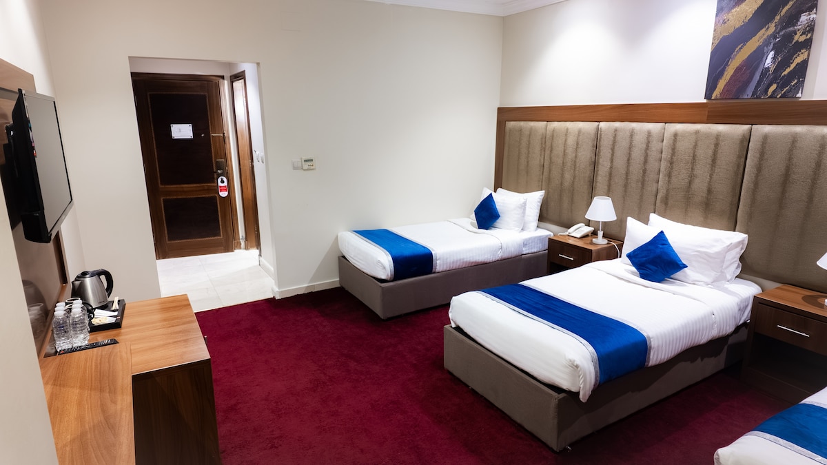 A private Hotel Room No Strangers. - Zad Al Safa – 3 Beds Comfort Private Room (Makkah) - Spacious 3 beds room at Zad Al Safa Hotel, ideal for Friends and Parents visiting Makkah for Umrah. The room is part of a recently renovated property, offering clean bedding, comfortable mattresses, air-conditioning, private bathroom, and daily housekeeping. Guests benefit from a scheduled shuttle bus to Al Haram, 24hours. Affordable, practical, and designed for a peaceful stay close to the Holy Mosque.