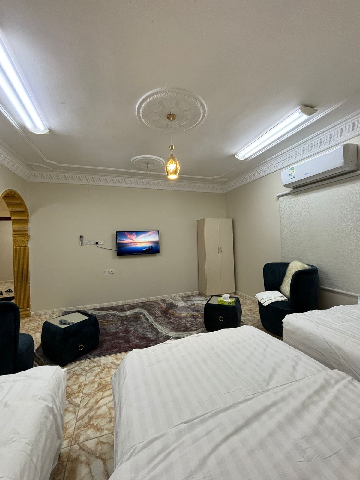 • 🛏 غرفة ماستر بدورة مياه خاصة + غرفة بسريرين مفردة • 🛋 صالة فاخرة • 🍳 مطبخ مجهّز بالكامل يحتوي على: مايكروويف، ثلاجة وفريزر، غلاية، طباخة كهربائية، مع ضيافة شاي وقهوة ومياه شرب • 🧺 غرفة غسيل مجهّزة • 🚿 دورتين مياه مع مستلزمات فاخرة (سليبر، فرشاة أسنان، شامبو، شاور جل، ومنشفة) • 🌐 إنترنت 5G عالي السرعة • 📺 شاشة ذكية بدقة 4K • 🔑 دخول ذاتي • 🚗 10 دقائق عن المسجد النبوي • 🚗 5 دقائق عن محطة قطار الحرمين