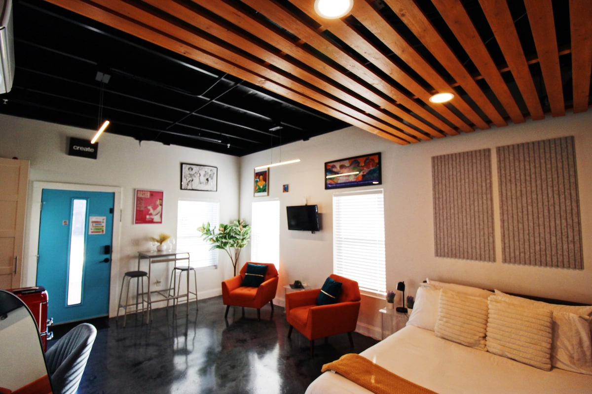 스튜디오에 오신 것을 환영합니다! 이 세련된 1층 스튜디오 아파트(2023년 건축)는 다운타운, 샌안토니오, 앨러모, 리버 워크에서 몇 걸음 거리에 있습니다. 하이라이트: + 전용 출입구 및 뒷문 + 현대적인 마감재 + 콘크리트 바닥 + 높은 천장 + 아름다운 주방 + 퀸사이즈 침대 + 접이식 트윈 침대(3인 그룹 이용 가능) + 레인 샤워기가 있는 스파 욕실 + 새로운 LG 세탁기 및 건조기 + 냉장고 및 냉동고