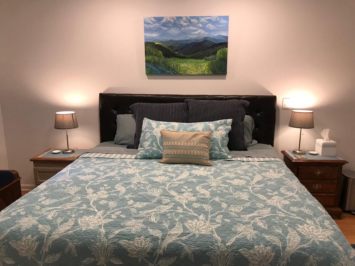 Private entry, quiet, historic, 3 blocks to Downtown Mall. 2nd floor suite, wood floor, queen bed; loveseat, electric fireplace, study w desk, 2 adjoining bathrooms-1 compact shower-one 4' clawfoot tub. Extra bedroom - $35/night. Private coffee room/library, compact refrigerator, microwave, ceramic cookware, cutting board, full dish set, flatware, wineglasses, electric kettle, pour-over coffee Chemex; locally ground coffee, bakery breakfast bread, NO KITCHEN or stove-Support local restaurants!