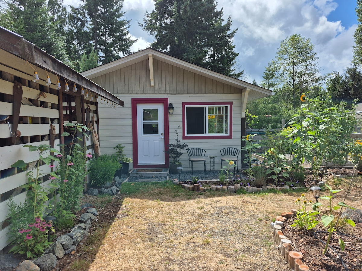 조용한 동네에 위치한 사랑스럽고 프라이빗하며 에어컨이 설치된 아치형 천장 통나무집으로, 유리 전면이 베인스 사운드와 밴쿠버 섬의 산을 내려다볼 수 있습니다. 전용 출입구가 있는 독립형 숙소입니다. 로프트에는 퀸사이즈 침대, 메인 층에는 싱글 침대가 있습니다. 샤워기가 있는 전용 욕실. 해변을 전용으로 이용할 수 있습니다. 페리와 가깝고, 현지 마을까지 도보로 가까운 거리에 있습니다. 이 숙소는 거동이 불편한 분이나 어린이 동반에 적합하지 않습니다. 저희는 청소비를 부과하지 않습니다.