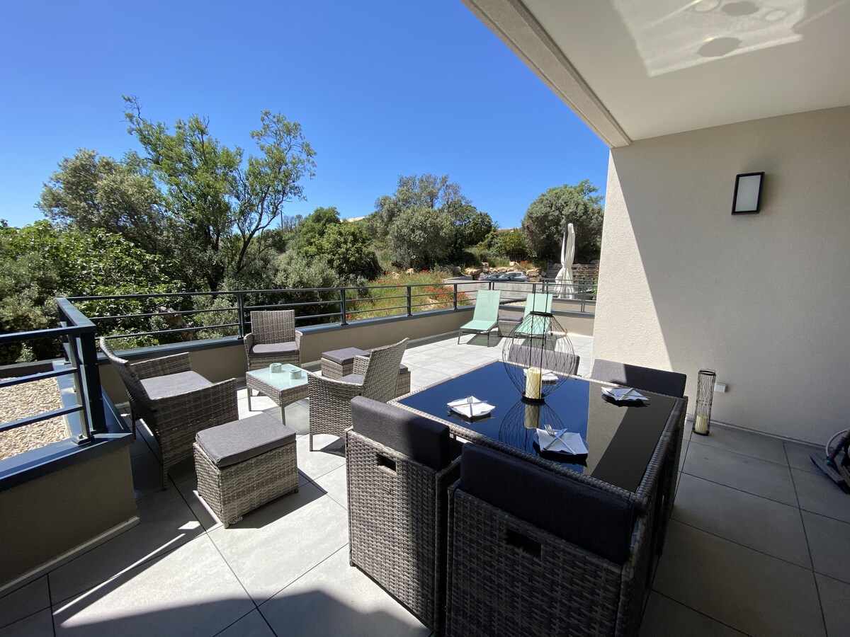 Charmant studio neuf niché sur les hauteurs du centre de Porticcio. Commerces et plages à seulement 1. 5 km. La terrasse de 20m2 est orientée plein sud avec une pergola. Il est tout équipé et la literie est très confortable (convertible de qualité) Il est idéal pour un couple. C'est un emplacement parfait pour découvrir la Corse (randonnées, plages, plongée, sports nautiques...) Les abords de la résidence sont en cours d'aménagement (celle ci ayant été livrée récemment)