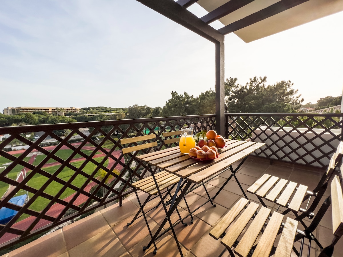 Modern and fully furnished studio in a peaceful area of Albufeira (Olhos de Água), within walking distance of Praia da Falésia, as well as restaurants, cafés, and supermarkets. Located in the resort-style Aldeia das Açoteias, ideal for couples and families. Features a spacious terrace with pine forest views, outdoor dining, two swimming pools, public parking, and a well-maintained garden with mature pine trees.