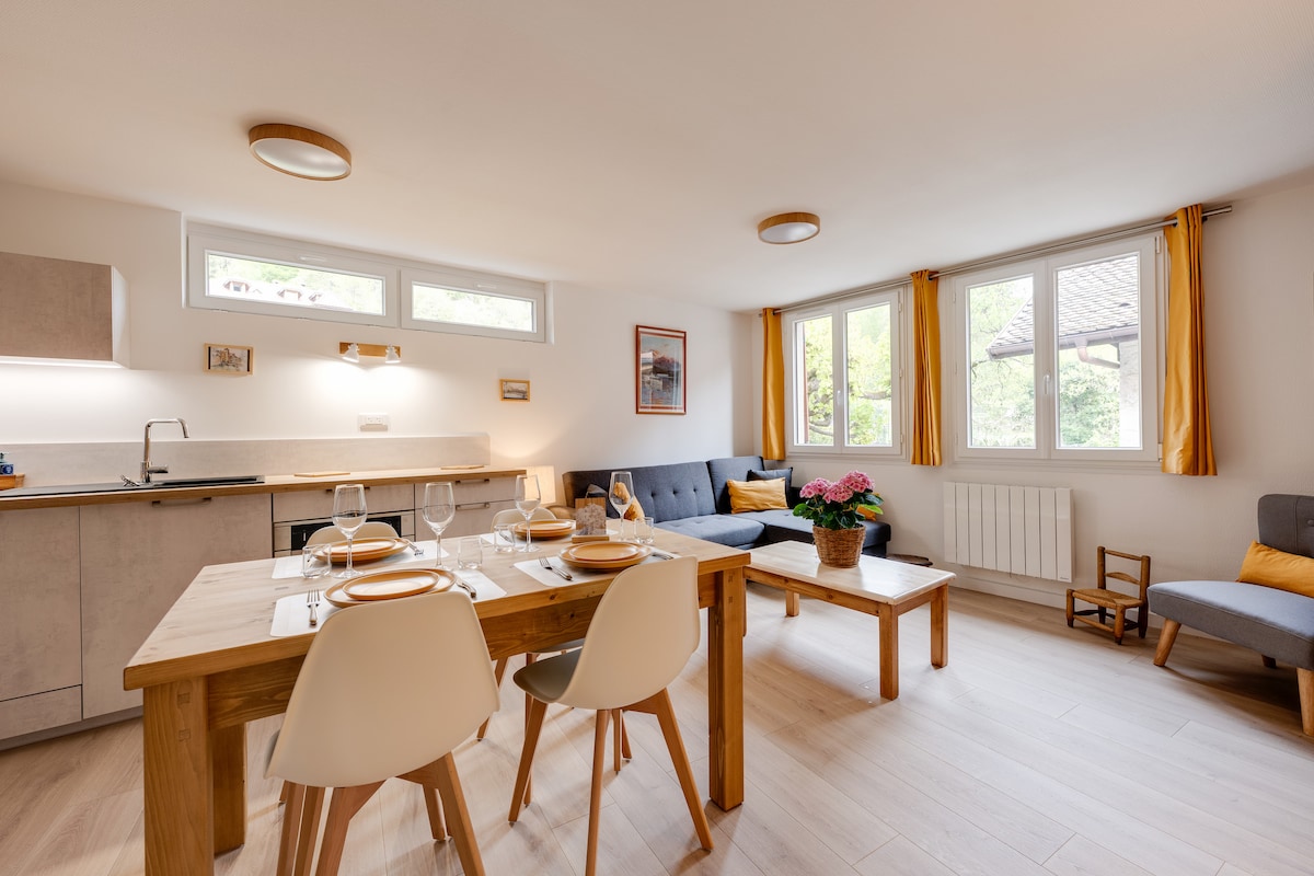 오프닝 탁월한 위치 호수 기슭에서 도보로 500m 자전거 도로인 베르뜨 거리에서 도보로 250m 안시에서 6km 스키 슬로프에서 30분 전용 정원 아름다운 거실 매력 마을에서 가장 오래된 건물 중 하나로, 세심하게 개조되었습니다. 밝고 매우 잘 갖추어짐: 평면 스크린 2개: 각 침실에 1개씩 샤워실 2개: 침실 당 1개 별도의 화장실 1개 오븐, 전자레인지, 냉장고, 냉동고, 인덕션 쿡탑이 있는 주방 건조기, 세탁기.. 주차장 1개