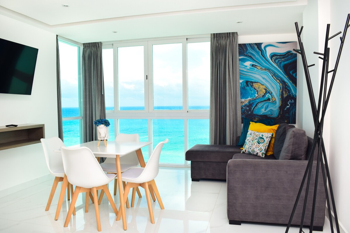 Directly on the beach. Views are spectacular as soon as you walk through the front door. Both the living room and the bedroom have views of the sea. Facilities like pools, jacuzzi, lounge chairs, shades, gym, tennis court are available for you (for free) High speed Wifi All inclusive optional through the hotel for food and drinks as we share facilities with Oleo Cancun resort (today $95 usd p/p per day) There are also 3 restaurants across the street (a la carte) + a convenience store.