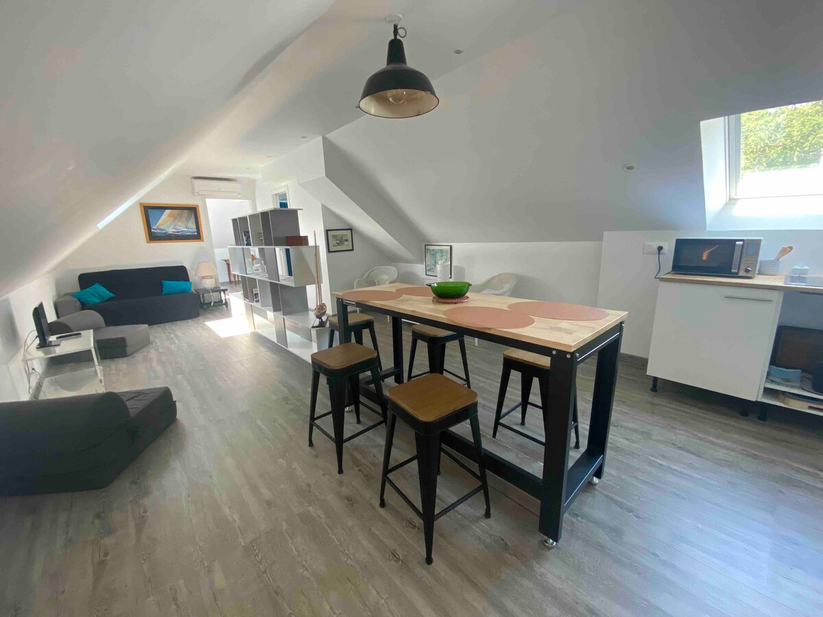 Bienvenue chez nous ! "L'Etage" est un grand studio classé "Meublé de Tourisme" situé à l'entrée de la Presqu'île de Quiberon à proximité des plages, des spots de surf, de kite et des sites d'intérêts (Mégalithes, Ria, Côte sauvage, Grand Site Dunaire, GR34... ). Nous l'avons conçu avec grand soin pour nos retours de l'étranger où nous vivons. Vous apprécierez son ambiance agréable et reposante ! LINGES DE LIT ET DE TOILETTE NON INCLUS/SUR DEMANDE (Supplément 20€)