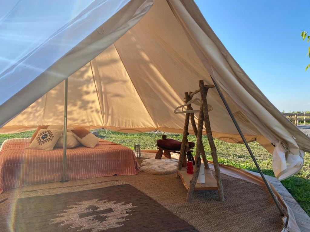 Sur une grande parcelle pour plus d'intimité, une tente de 20 M2 décorée dans un esprit zen et romantique. Jacuzzi privatif sur votre terrasse. Pour une expérience inoubliable, un braséro face au paysage champêtre pour faire griller des chamallows ( offerts) et vivre un moment romantique devant un feu sous les étoiles. Toilettes sèches sur emplacement. Salle d'eau privative à 40 mètres de la tente. Frigo avec soft drink offert. Petit déjeuner, linge de lit et de toilette, ménage sont compris