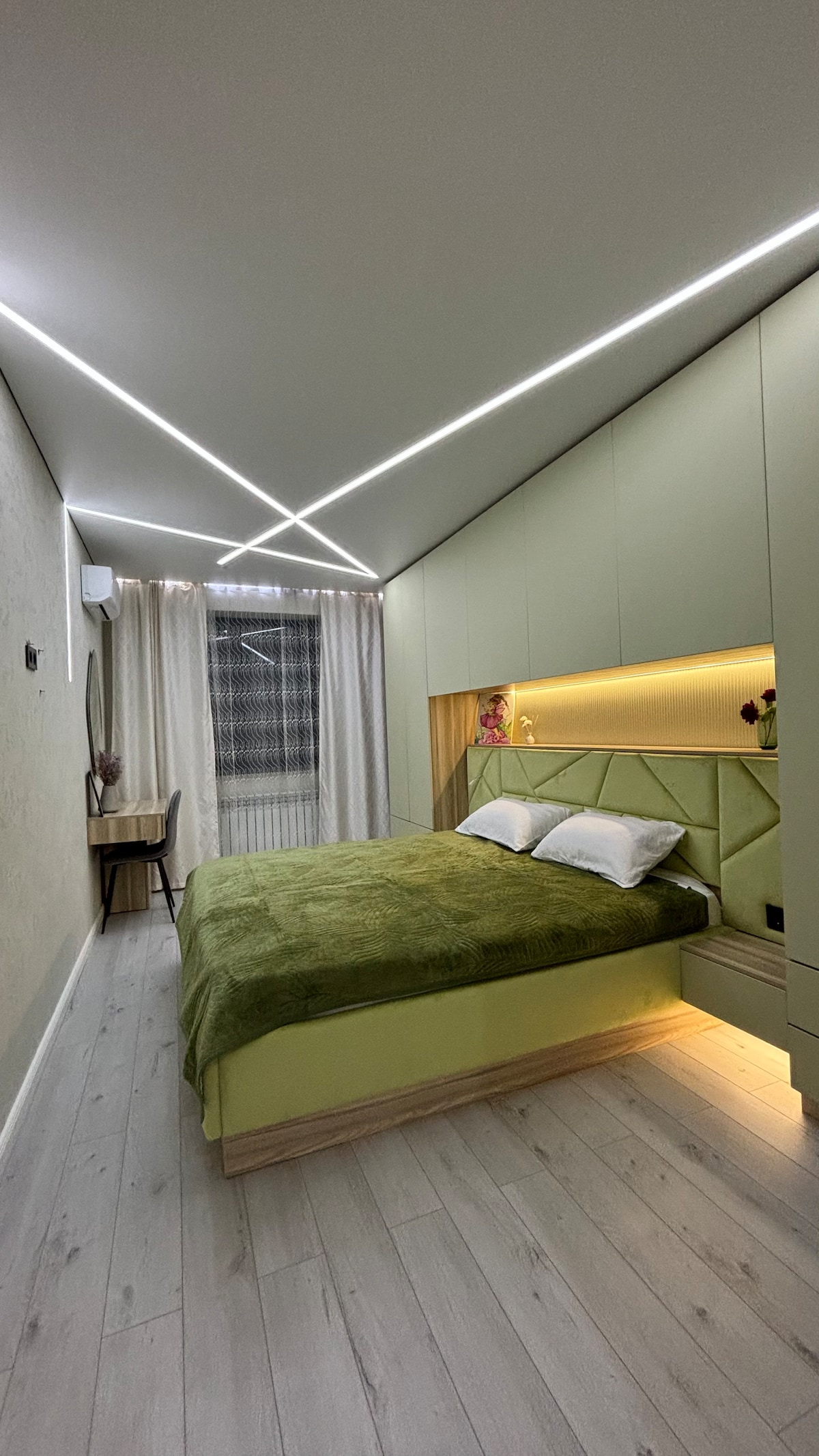 Уютная квартира в самом центре, с видом на горы и гостиницу Казахстан. В приятных оттенках, которое делает отдых спокойным. Внизу дома открывает свои двери рано утром пекарня , кофейня. Множество ресторанов и кафе различной кухни. Станция метро «Байконур», отель Rixos, Арбат, банкоматы, Центральный стадион. На двери кодовый замок, в любое время бесконтактное заселение выселение.