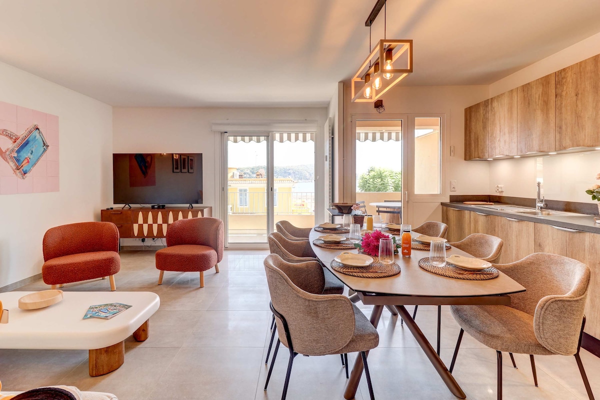 Exclusive top-floor apartment in the heart of Golfe Juan! Lodge Painting and Bathroom RENEWED late 2025! Directly overlooking the bay and the marina Amazing view of Cap d'Antibes and Lerins ! Max 2 Guests Salon Cooking Area Coin de Nuit Bathroom Terrace WiFi AirConditioning Tv Elevator Parking (Payant) Double "French" bed (Ergonomic mattress), comfortable shower, glassceramics hob, microwave oven, dish washer, washing machine, fridge, electric kettle, Nespresso coffee machine, hairdryer, iron