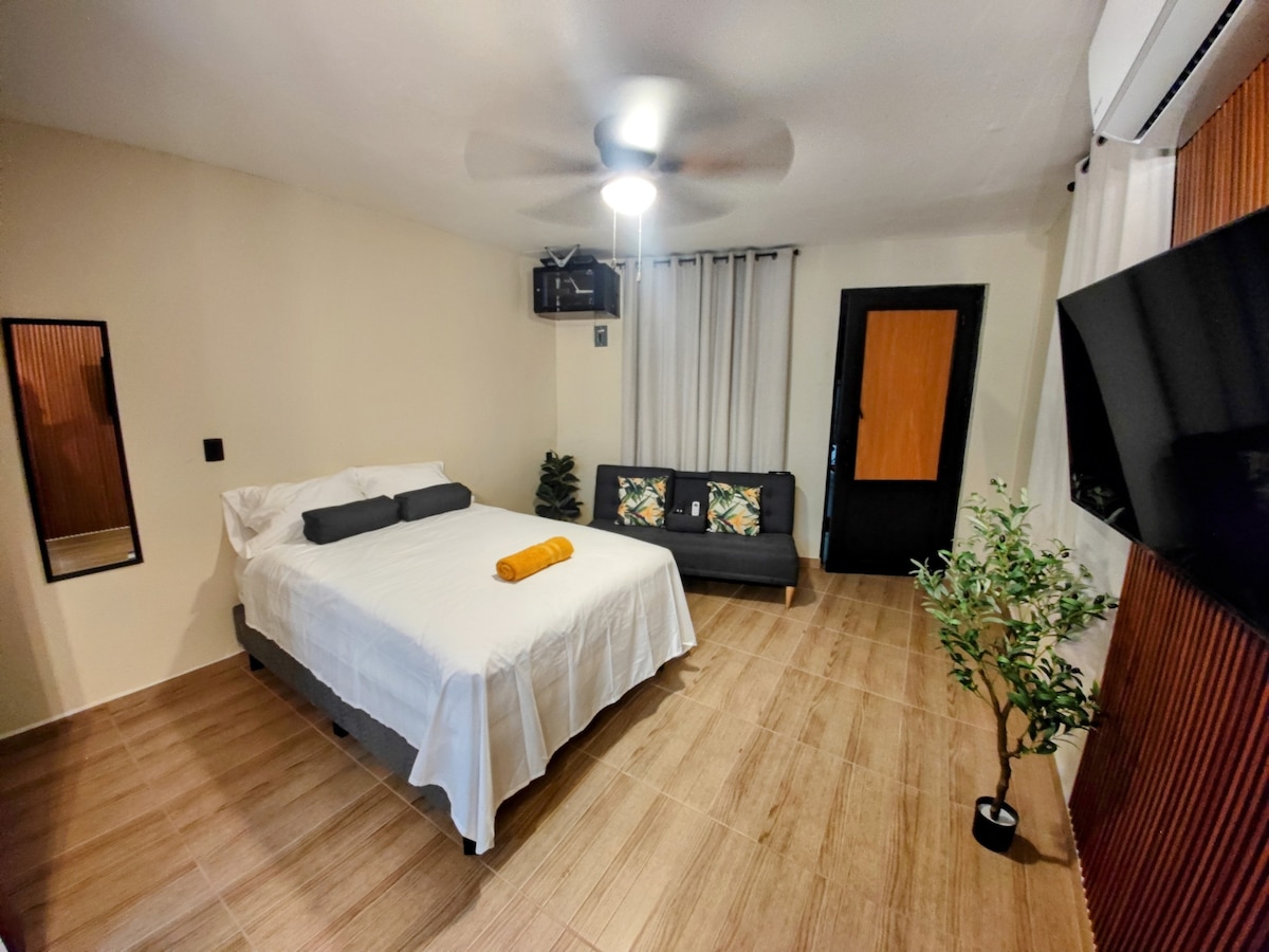 "저희 아파트는 미라마비치에서 차로 5분 거리에 있습니다. 가스레인지, 오븐, 믹서기, 커피 머신, 기본 주방용품이 구비된 주방, 온수가 나오는 욕실이 있습니다. 마스터 침실에는 미니스플릿, 더블 침대 1개, 퀸 사이즈와 대형 옷장이 있습니다. 퀸 사이즈 침대가 있는 다른 방 (에어컨 없음). 40인치 스크린, 와이파이, 케이블 TV가 있는 거실. 바베큐, 테이블, 의자가 있는 테라스.