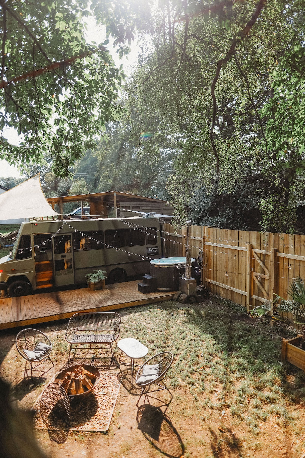 Escape to our exquisitely converted tour bus, in ancient woodland 10 minutes from Alton Towers! Cozy up inside or enjoy evenings by the firepit under the stars. Immerse yourself in the magic of our TREETOP CINEMA—a hand-woven net high among the trees. At night, the net comes alive with a fluorescent glow, creating a magical ambiance for watching films and music videos in the trees.. Relax in the wood-fired hot tub and let this enchanting escape weave unforgettable moments of romance and wonder.