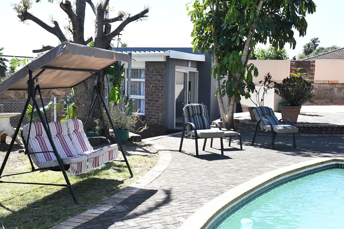 Home away from home in a safe environment with CCTV and alarm systems. A self catering facility with spacious ensuite bedroom, lounge and kitchen. Suitable for a family or group of friends. Spacious outdoor entertainment area and swimming pool for your relaxation. Close to amenities and Bonza Bay Beach. Wifi available 24/7