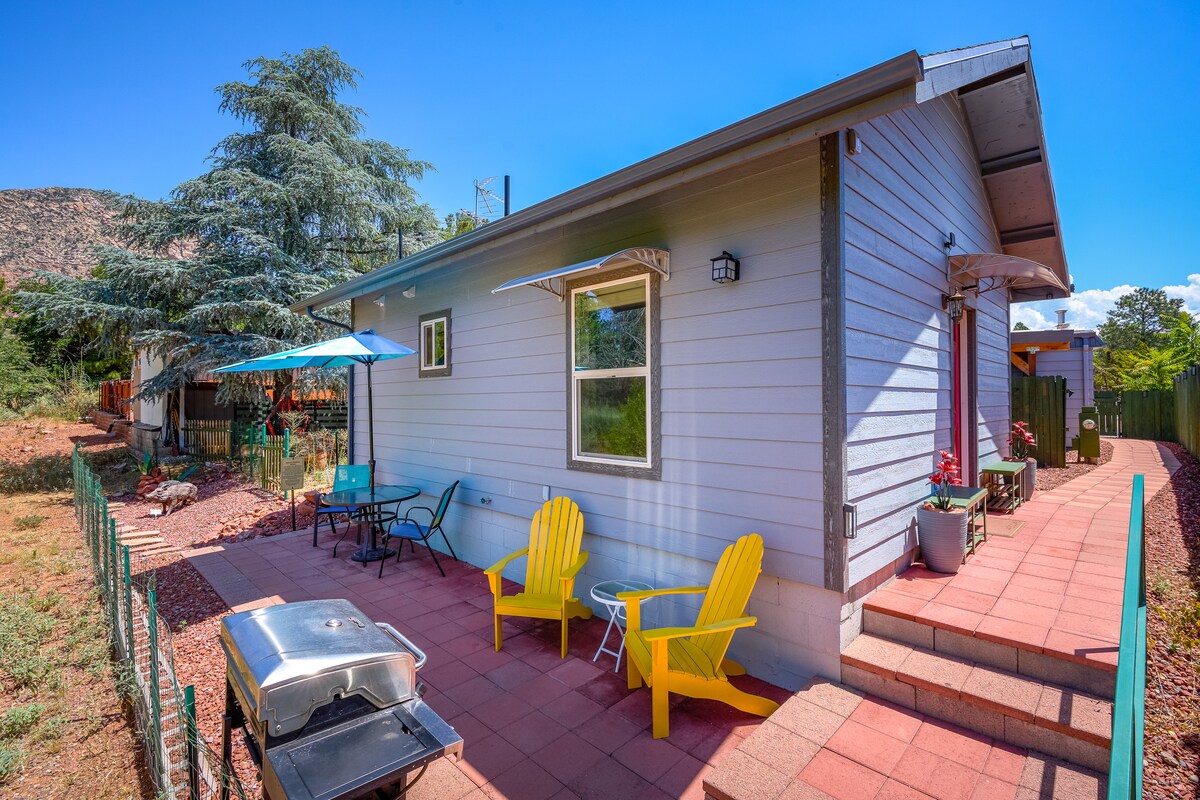 GLOWING MOUNTAIN VIEWS! West Sedona private casita at the base of Thunder Mtn. Walk to Andante trail system for hiking & biking or Amitabha Stupa for meditation. Cozy, tranquil , and convenient, our 4 room, 450 sq ft casita has private patio, kitchen, washer/dryer, central air, & off street parking. Close to restaurants & grocery store. Quiet neighborhood. Equipped for 4 guests. Dogs & cats welcome! Perfect for families w/infants, single travelers, & couples. Work friendly w/fast wi-fi.