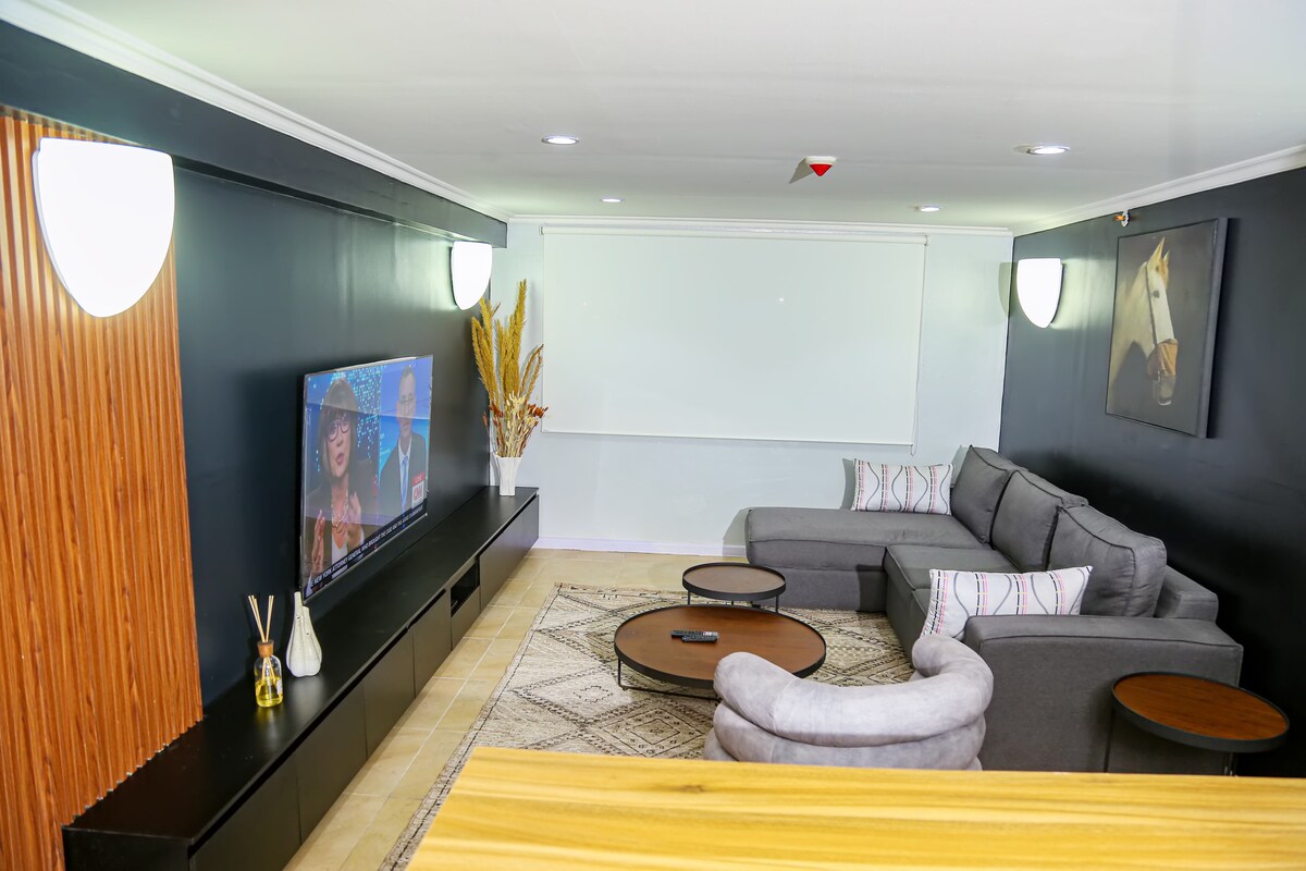 I was bold enough to use dark walls for this unique one bed that has a bit of skyline view and view of the lake behind the building. It is spacious with modern amenities plus guests get to use the gym downstairs. The apartment building is in the same premises with Festival Mall with Shoprite outlet for food and groceries, pharmacy, saloons/barbershops,boutiques, restaurant, lounge, game arcade and cinema. There is also a pool downstairs but guests have to pay to use it.