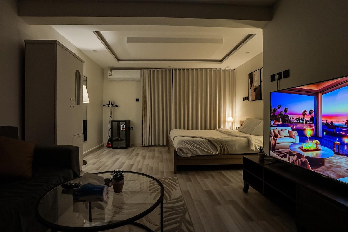 리야드의 현대적인 휴양지로 오신 것을 환영합니다. 이 아늑한 스튜디오는 솔로 여행객, 커플, 비즈니스 게스트에게 적합합니다. 스마트 도어록으로 셀프 체크인, 빠른 와이파이, 넷플릭스와 유튜브가 설치된 70인치 스마트 TV, 블랙아웃 커튼이 달린 편안한 퀸사이즈 침대, 가벼운 식사를 위한 간이 주방이 있습니다. 그라나다 몰과 지하철역까지 도보로 이동할 수 있습니다. 전용 출입구, 무료 주차장. 단기 숙박, 원격 근무 또는 주말 휴가에 적합합니다. 언제든지 체크인할 수 있으며, 완전한 프라이버시와 편안함을 제공합니다.