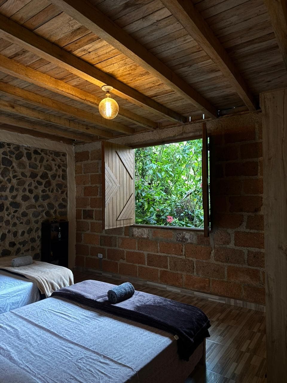 Two-level cabin with sky view. Private bathroom and accommodation capacity for up to 5 people. Located on a rural estate in Jardín, Antioquia (15 minutes by car from the town). We offer bilingual service and breakfast. Nearby activities include coffee/honey tours, bird watching, horseback riding, Chorro Blanco waterfall, and Cueva del Esplendor cave. Ideal for families, couples, and freelancers. We provide Starlink Internet with speeds up to 220mb. National Tourism Registry No. 221026