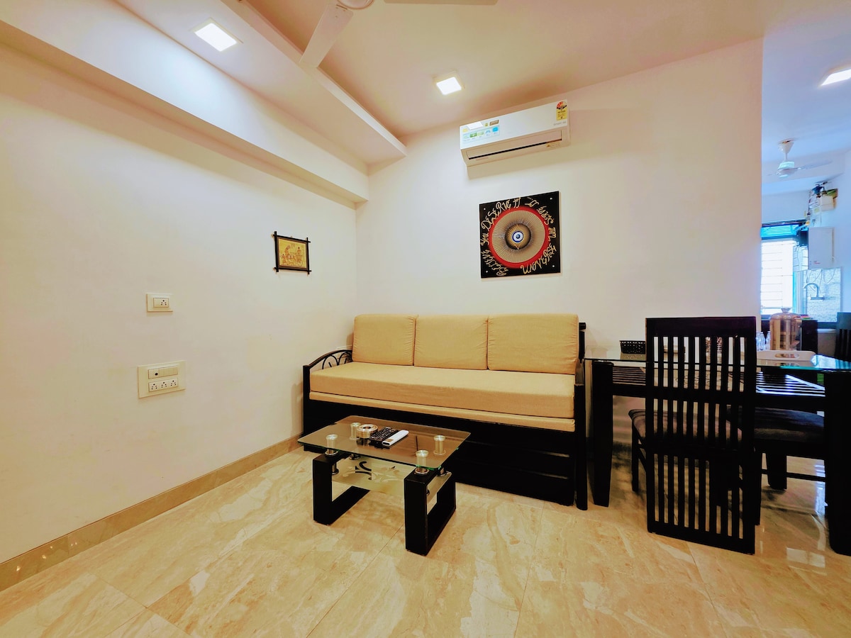 Relax and make good memories at this unique and family-friendly place. Its a 1 Bedroom fully furnished Serviced Apartment along with a Livingroom and a kitchen, close to Juhu Beach. There are ACs in all the rooms. Kitchen is fully equipped. We love to serve our guests to their highest level of comfort. You can check the reviews of the other Apartments under my profile. Daily Housekeeping is done by the caretaker. There is a full size Sofa Bed in the Livingroom for 2 adults.