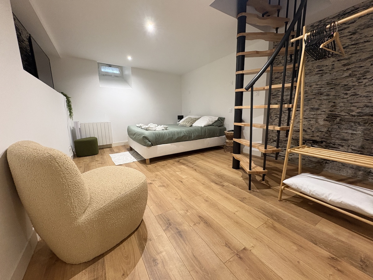 Discover "L'Oasis": 50sqm stylish duplex in Angers center. Includes a private secured garage in the building for total peace of mind. Indulge in the Spa area (sauna & whirlpool in-room) or a movie night with the projector (Netflix/Prime/Disney+) from your Queen Size bed. For longer stays, enjoy a fully equipped kitchen, modern bathroom and sofa bed in a beautifully decorated living space.