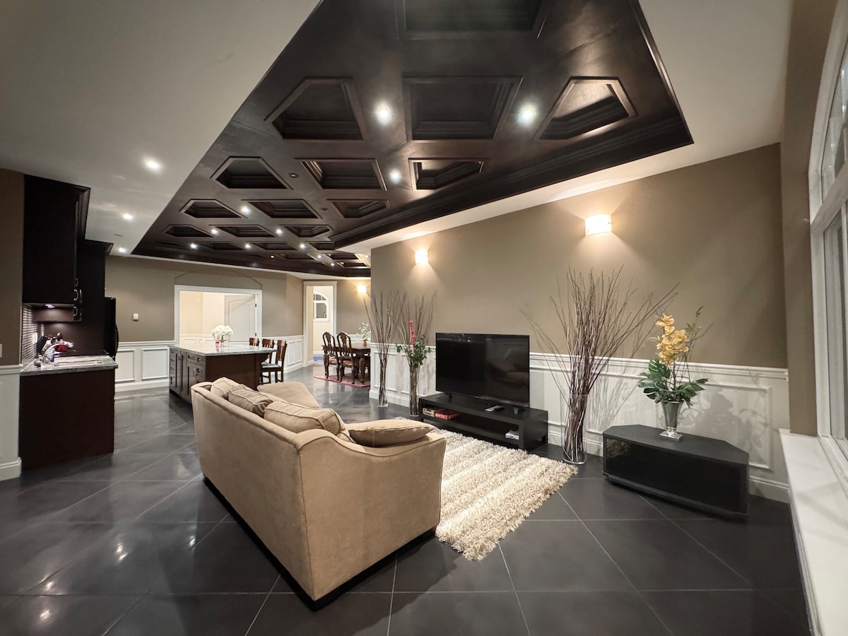 Kick back in this calm, stylish ground level suite. Enjoy your 2 bedroom oasis on the serene mountainside of Coquitlam. Ready to welcome you is a KING size bed with 500 thread Egyptian cotton sheets, a moody living room, a cozy fireplace, and a separate reading/yoga room. The second bedroom offers a pull-out queen sofa. Gravel on the side of the house leads to the suite at the back. Turn on the fireplace and watch your favourite movie on a Samsung Oled TV.