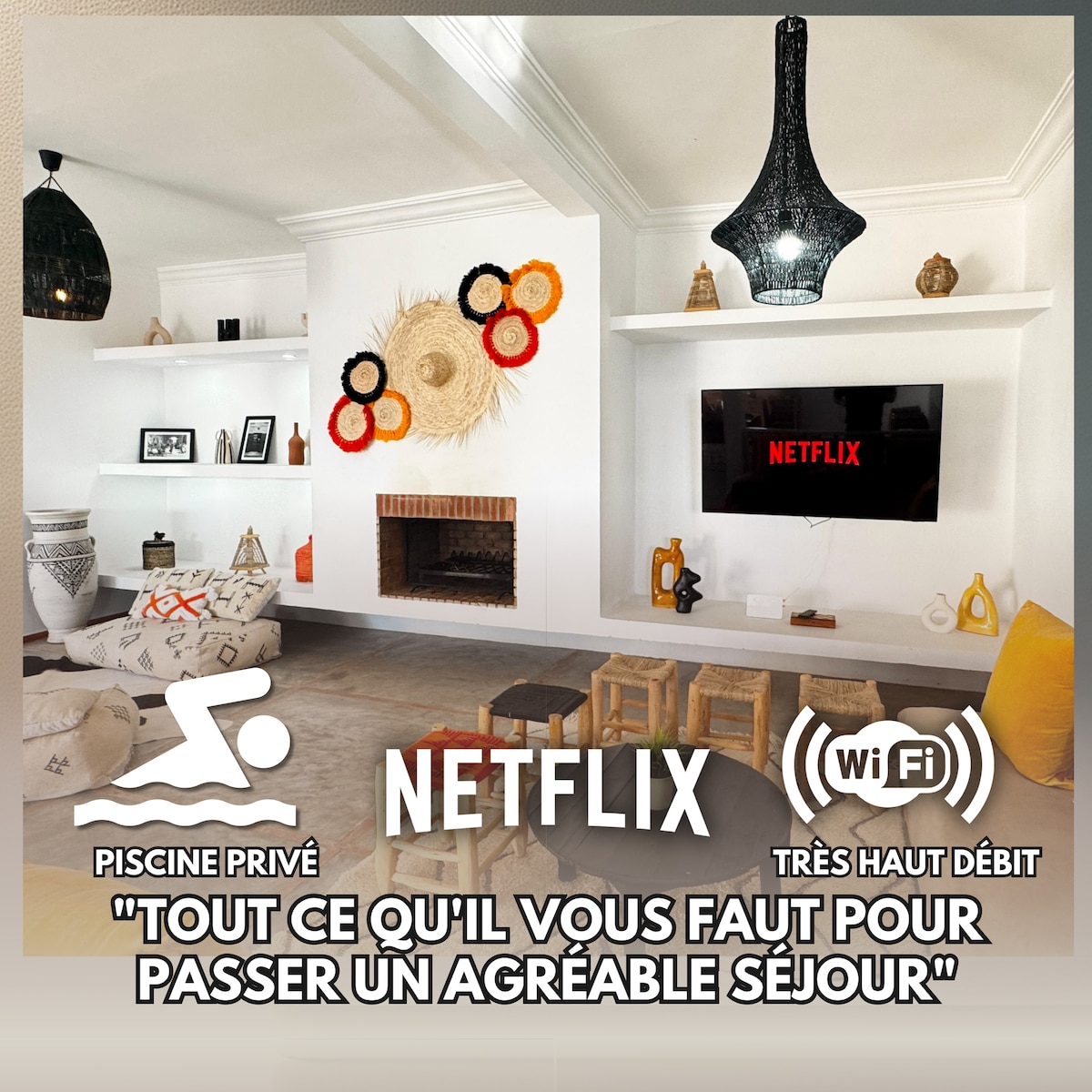 ❤️ 휴식을 취하고, 자신을 챙기고, 활력을 되찾으세요 ● 3분 – 유명한 와키 비치 ● 5분 – 아쿠아 미라지, 팜골프 ● 7분 – Bd Mohamed VI, 메가라마, 카트 레이싱 ● 8분 – 알 마자르 몰, 오아시리아 및 피칼바트로스 아쿠아파크 ● 20분 – 제마엘프나, 공항 및 도심 ❤️ 특징 및 편의시설: ● 대형 거실 공간, 스마트 TV ● 퀸사이즈 침대 3개 | 현대적인 욕실 2개 ● 에어컨 및 난방, 세탁기 ● 초고속 와이파이 ● 전용 수영장 및 정원 주방 시설 ● 완비 ● 세탁기 ● 무료 전용 주차장 ● 연중무휴 보안 주거지