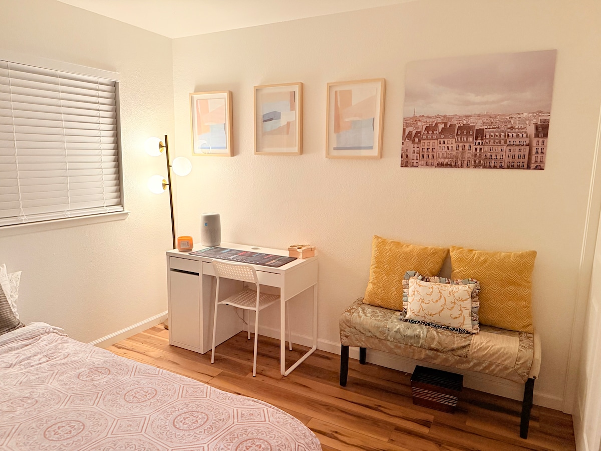 Charming Studio with Private entrance, Walk-in closet & an Exclusive bathroom. Wakeup to the peaceful view of the open hill and birds chirping. Located in a quiet family neighborhood. Convenient distance to public transportation, eateries, and supermarket. Self-checkin/out with digital keypad at your convenience. No loose keys. Home features a comfortable queen size bed with 2 firm pillows, 2 plush pillows, comforter and clean linens. Work station/office desk.