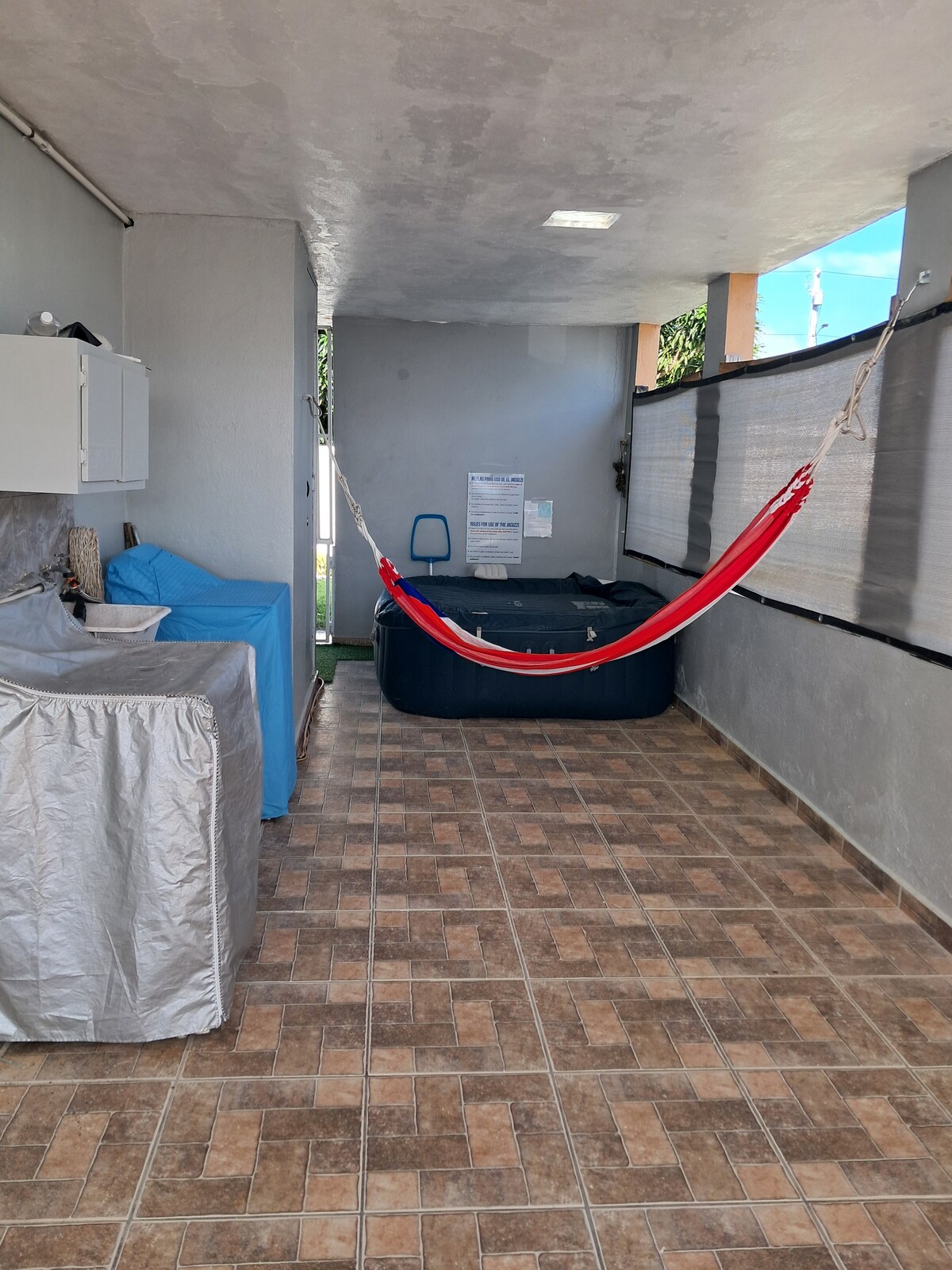 태양 에너지 시스템 배터리 포함 온 가족이 즐길 수 있는 자쿠지, 당구, 비디오 게임, 농구 아케이드, 도미노 및 안뜰에 있는 유아 공간. 바비큐, 세탁기 및 건조기. 한 방에는 퀸 사이즈 침대, 다른 방에는 풀/트윈 사이즈 이층 침대, 거실에는 소파 베드가 있습니다. 해변에서 도보로 2분 거리에 있는 매우 조용한 지역, 맛집과 즐길 거리가 많은 해안 지역, 후마카오 자연 보호 구역에서 2분 거리, 나구아보 맬레콘에서 10분 거리.