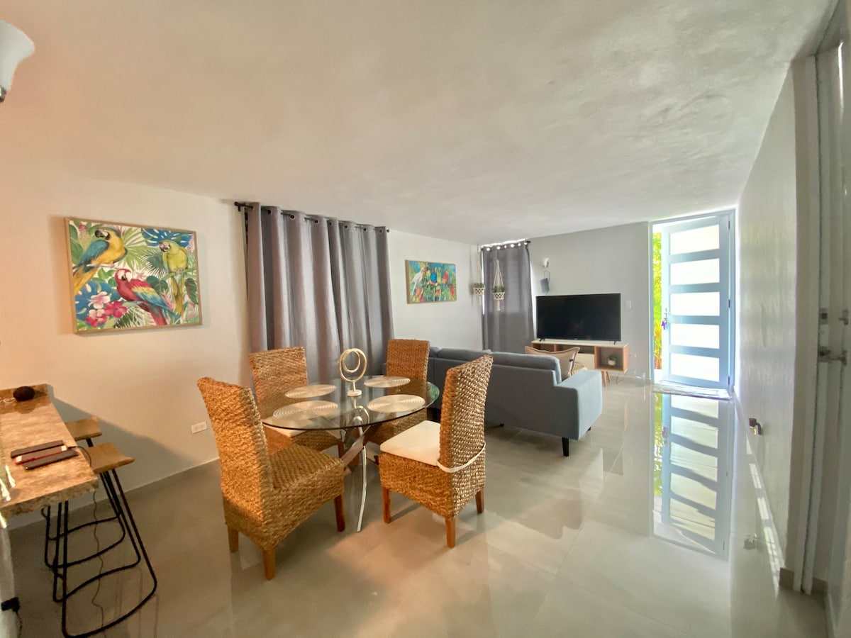 매우 아늑한 숙소입니다. 2인용 방이 있습니다. 소파 베드, 소파 베드, 퍼바도 욕실, 프리바도 욕실, 완비된 사촌, 전용 주차장, 에어컨, 아파트 내부에 건조기가 있는 세탁기가 있는 공용 공간. PR 53, 30번 고속도로에서 가깝고, 팔마스 레알 쇼핑 센터, 월마트, 패스트푸드 레스토랑 등에서 5분 거리에 있습니다. 7개의 바다, 푼타 산티아고, 팔마스 델 마르, 루키요 욕실, 말레콘 나구아보 등 해변 근처의 동쪽 지역에 위치하고 있습니다.