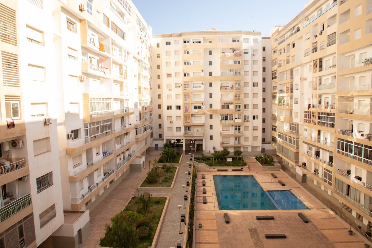 Appartement, dans le meilleur quartier d'Agadir, à quelques pas de la plage et à quelques pas du centre commercial. Il y a des cafés / restaurants incroyables et propres à deux pas de l'appartement. La Résidence est à proximité de la plage à pied 10 min .l'aéroport est à 30min en voiture. Vous êtes sécurisé 24h/24 et accédez à 2 piscines, appartement en 2éme étage ,immeuble avec ascenseur .