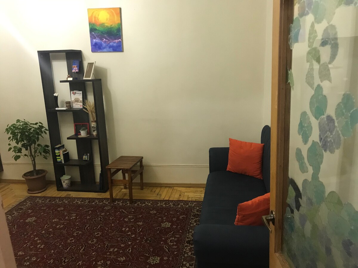 이 아파트는 매우 사랑스럽고, 5층짜리 오래된 소비에트 시대 석조 건물의 5층에 있습니다. 주방/욕실을 제외하고 대부분의 가구는 리스타일 빈티지 가구입니다. 침실과 사무 공간으로 사용할 수 있는 두 번째 작은 방이 있으며, 꽤 편안한 침대("타크타")도 있습니다. 제 딸의 아파트이지만 딸이 국외에 있을 때 임대합니다. 저희는 예레반에서 집처럼 편안하게 지내고 싶어하시는 게스트를 환영하며, 저희 숙소를 존중해 주시기 바랍니다.