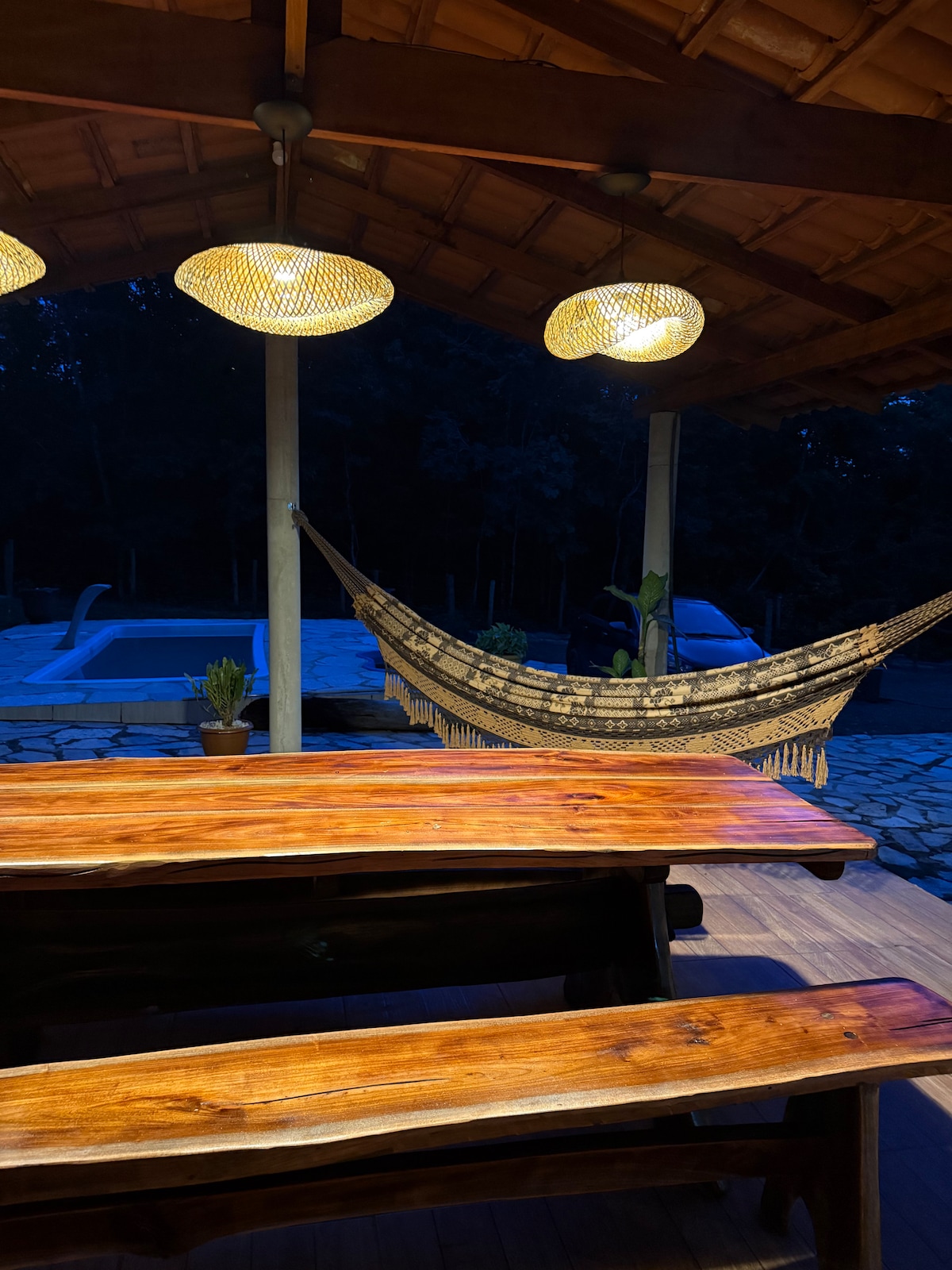 SIGA-NOS NO |NSTAGRAM @ENCANTOCERRADO Um refúgio moderno para casais no coração da natureza do cerrado. Com design contemporâneo e toques rústicos, a cabana oferece vistas panorâmicas, amanheceres e noites estreladas. Completa com uma cozinha totalmente equipada e sala de estar com hidromassagem. A varanda privativa inclui fogueira e piscina aquecida para momentos românticos. Uma oportunidade única de fugir da rotina, criar memórias e celebrar o amor em meio à natureza exuberante do cerrado.