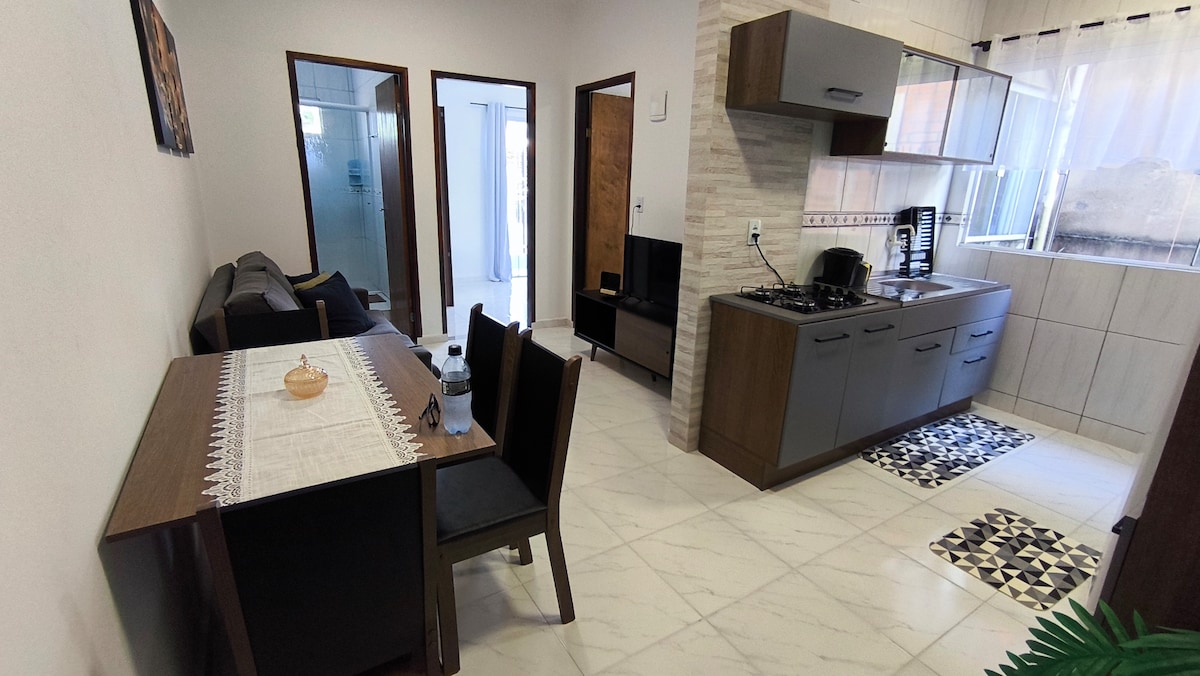 조용하고 아늑한 이 공간에서 휴식을 취하세요. 숙소는 새롭게 지어졌으며, 맞춤형 가구가 있는 침실, 더블 침대와 싱글 침대, 냉난방, 55인치 TV가 있습니다. 냉장고, 전자레인지, 인덕션 스토브, 필터가 달린 수도꼭지, 필요한 모든 기구가 갖춰진 주방. 기본 세탁기, 테이블, 다리미가 있는 세탁실. 크고 현대적인 욕실. 차고가 있는 넓은 야외 공간. 위치: 센트로/엑스포빌(주요 출입구) 10분, 12분. 센트레벤토스 카우 한센 및 BR 4분 거리
