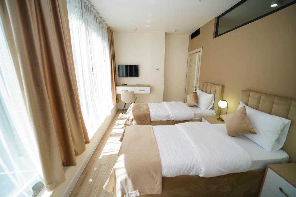 호텔의 매우 깨끗하고 가벼운 객실. 모든 객실에는 온도 조절 시스템이 갖춰져 있습니다. 세련된 디자인의 객실은 매우 아늑하고 편안하며 필요한 모든 것을 갖추고 있습니다. 이 방은 2인용입니다. 전용 및 싱글 (가족) 침대를 이용하실 수 있습니다. 번화가에서 멀지 않은 조용한 지역에 위치한 호텔입니다.