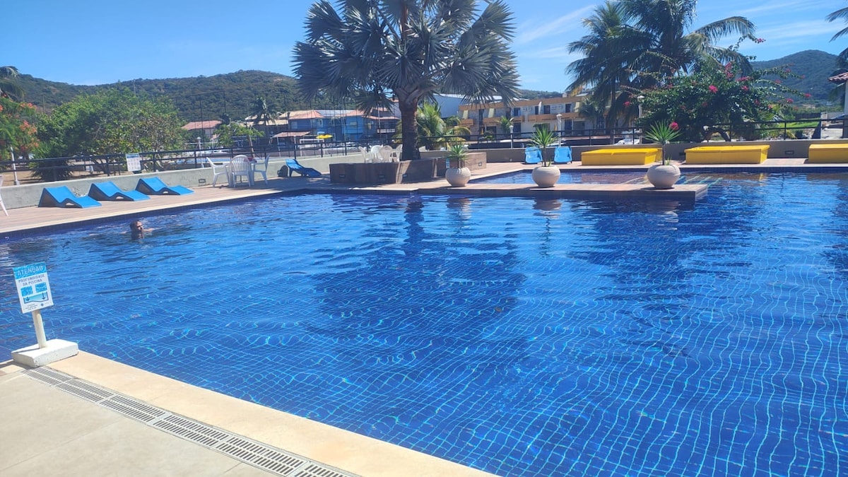 Rooftop com piscina, sauna, academia e vista de Cabo Frio. Acomodamos até 4 pessoas: com cama de casal, 2 colchões de solteiro,TV Smart e Wi-Fi. Cozinha equipada com fogão elétrico,panelas,sanduicheira, filtro de água,liquidificador,micro-ondas, frigobar, talheres, pratos, copos e taças. Banheiro com ótimo chuveiro,secador,kit com 2 toalhas de banho e 1 de rosto. Roupa de cama: 2 travesseiros, 2 fronhas, 1 lençol de elástico e 1 lençol comum. (sem troca; se solicitada, será cobrado taxa extra).