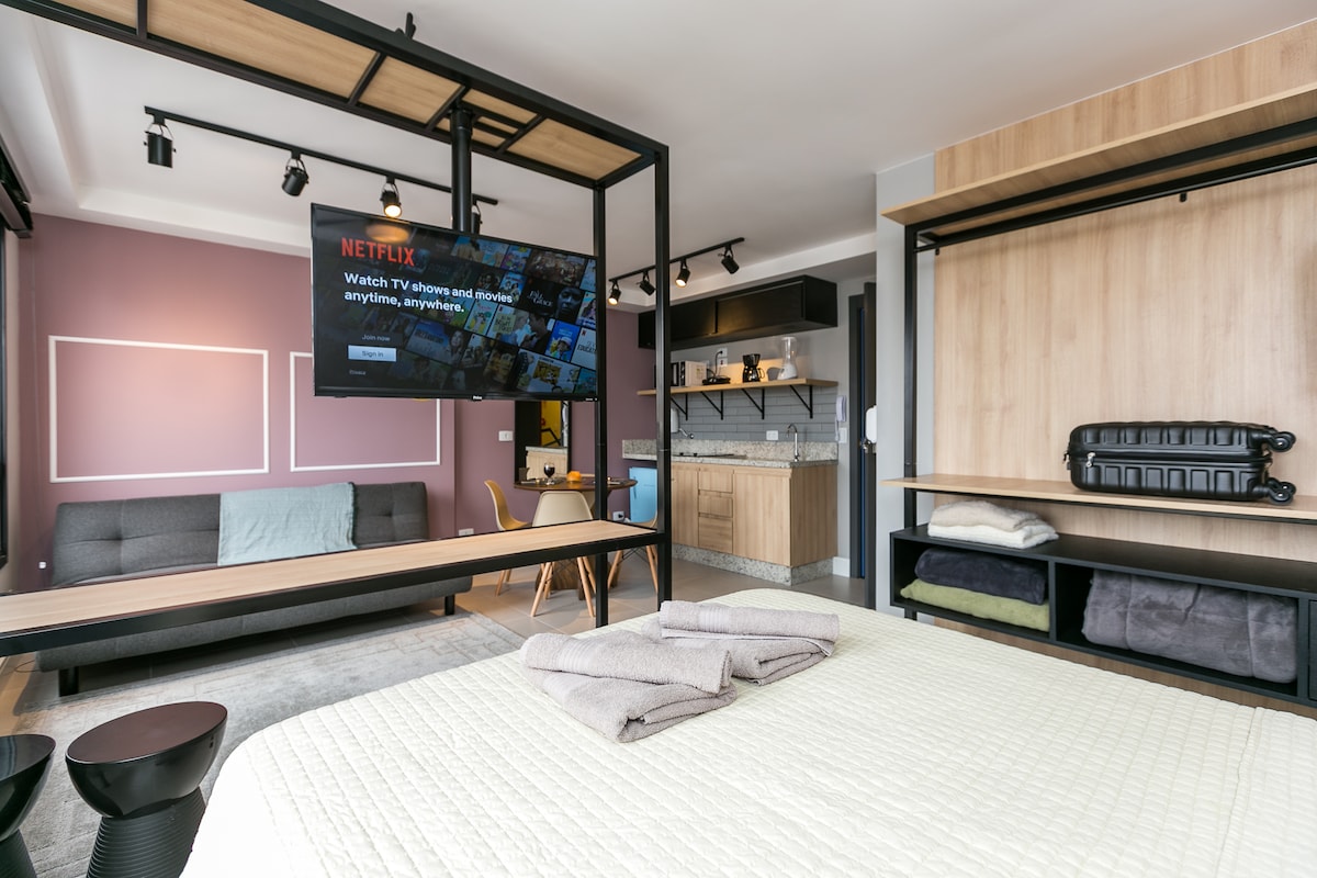 Studio moderno, no Centro Cรญvico โ ideal para quem busca conforto, praticidade e excelente localizaรงรฃo em Ctba. Ambiente climatizado, cozinha equipada e Smart TV โ perfeito para lazer ou trabalho. ๐๏ธ Acomoda com conforto atรฉ 4 pessoas, roupa de cama de qualidade. โข Piscina aquecida โข Academia โข Sauna โข Terraรงo โข Lavanderia (paga) โ ๏ธ Para uso da piscina o condomรญnio exige apresentaรงรฃo de atestado. ๐ Estacionamento disponรญvel no prรฉdio, valor R$ 35 por diรกria Pago via PIX ao anfitriรฃo.