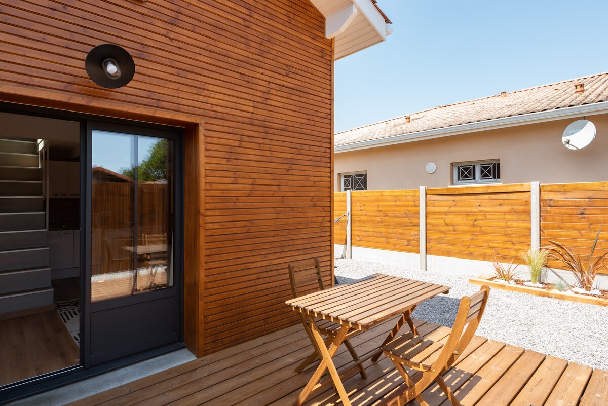 온 가족이 편안하게 머물 수 있는 평화로운 숙소입니다. - 좋은 요리를 준비할 수 있도록 완비된 주방. - 위층 침실의 바닥에서 천장까지 이어지는 창문에서 자연과 일몰을 감상하세요. - 정원 가구와 바비큐 시설이 갖춰진 테라스에서 가족 또는 친구를 위한 식전주가 모두 초록색으로 꾸며져 있습니다. 오뎅게 항구에서 5분, 듄 뒤 필라에서 30분 거리에 있는 탁월한 위치. 근처의 자전거 도로와 퇴비길 ☀️